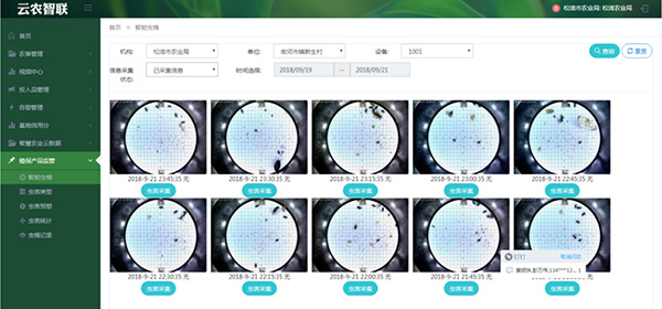 在無人監(jiān)管的情況下,可自動完成誘蟲、殺蟲、蟲體分散、拍照、運(yùn)輸、收集、排水等系統(tǒng)作業(yè),并與無線模塊相連,把數(shù)據(jù)發(fā)送至服務(wù)器端;進(jìn)行病蟲害統(tǒng)計與分析功能;并在網(wǎng)頁端顯示識別的蟲子種類及數(shù)量,根據(jù)識別的結(jié)果,對蟲害的發(fā)生與發(fā)展進(jìn)行分析和預(yù)測,為現(xiàn)代農(nóng)業(yè)提供服務(wù),滿足蟲情預(yù)測預(yù)報及標(biāo)本采集的需要。
